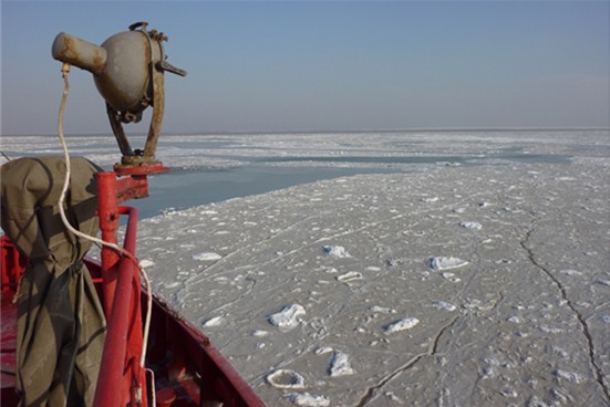 在平台水手长的指挥下,“勘404”轮迅速起锚,向海冰开战。破冰绝非想象的那么容易,既要将平台周围的冰面破坏挤碎,又要防止船舶碰撞平台桩腿,操纵起来必须要胆大心细。破冰本身对“勘404”轮这艘老龄船更是一种挑战,并具一定的危险性。为了避免破碎的海冰被吸入机舱海底门,造成主机冷却系统故障,同时还要保护“勘404”轮自身船体钢板,于士炳船长不断变换着船速快慢和舵角大小,力争在破冰的同时将不利影响降到最低。“勘404”轮首先按顺时针方向在平台近处破冰,然后按逆时针方向向平台远处推进。只见红白相间的勘404轮在经验丰富的于船长操控下,犹如一条出水的蛟龙,时而前进时而后退,回环旋转,浪花飞溅,碎冰翻滚,一派翻江倒海的气势。大块的浮冰逐一土崩瓦解,四处飘散。于船长还安排专门瞭望的水手,时刻观察大块浮冰和潮水的流向,以期望在最短的时间里达到最好的破冰效果。经过一个小时的破冰作业,平台四周大型的冰面已经完全不见了踪影,剩下的一些“残兵败将”,在洋流的作用下,顺利地飘离平台。