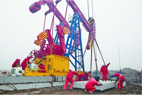 图为施工人员在为联浅1—6—2组装抽油机。通讯员张磊摄