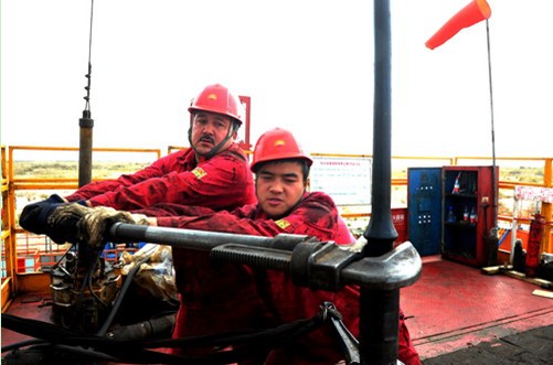 图为员工正在进行完井试油作业。