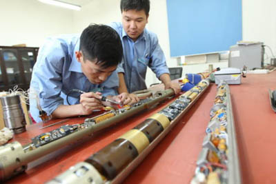 图为员工对EILog阵列感应仪的补偿声波声系仪器进行维修。