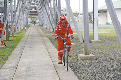 LPG轻烃分馏厂厂内禁止机动车行驶,又因为巡检路线很长,不少印尼员工选择骑自行车在装置间的小路上巡检。远远看去,这也成为灰色装置间的一道风景。图为骑车巡检的巡线工。