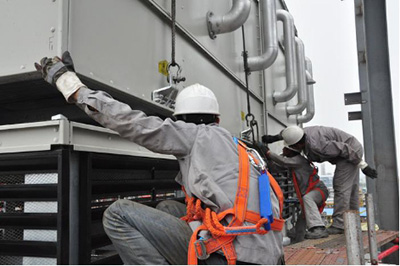 起重人员正在指挥200吨吊车把新型空冷器安装就位
