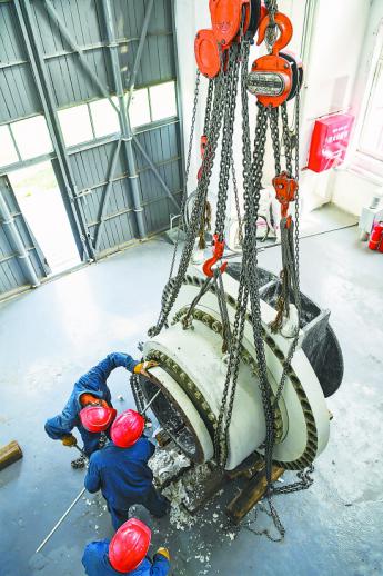 图为检修技术人员清理循环气压缩机组外壳体,为检修回装做准备。