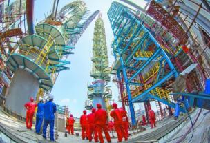 图为催化蒸馏上塔完成起吊安装现场。