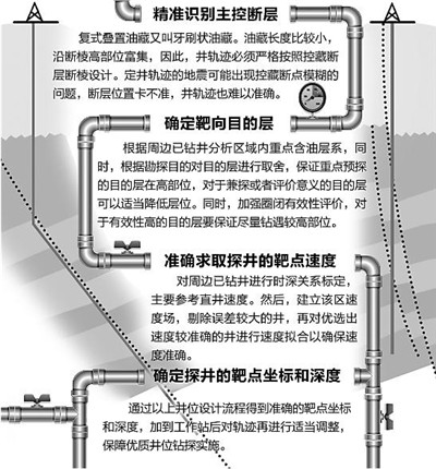 如同一把钥匙开一把锁,解决问题就要“对症下药”。科研人员决定通过新技术新方法的科学运用来实现降本增效。大家潜心研究,瞄准靶区目标层系,优化井身轨道设计,降低勘探综合成本,从“精准识别主控断层—确定靶向目的层—准确求取探井的靶点速度—确定探井的靶点坐标和深度”四个流程入手研究,首创复式叠置断块油藏井位系统设计流程,为科学有序、降本增效推进探井钻井工作给予强力支撑。