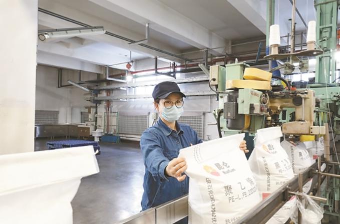 员工正在农膜产品包装线上检查产品质量。谢文艳 董志华 摄
