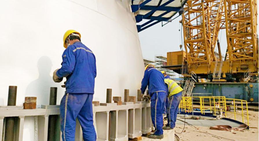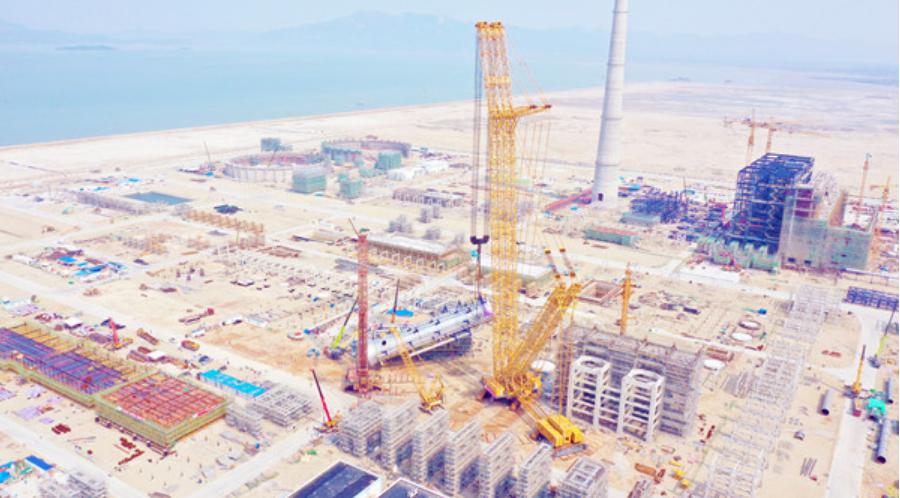 此次吊装的洗涤塔下段高约55m,吊装总重量约1400吨,后续吊装及焊接工作预计本月底全部完成。