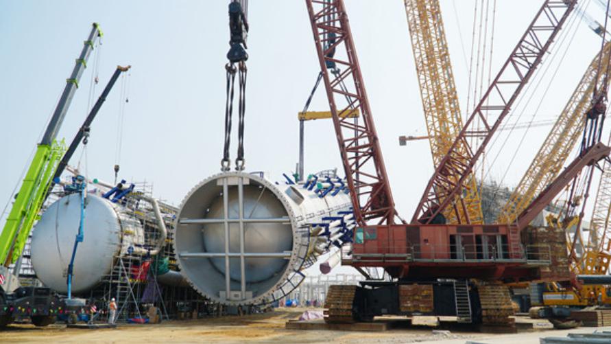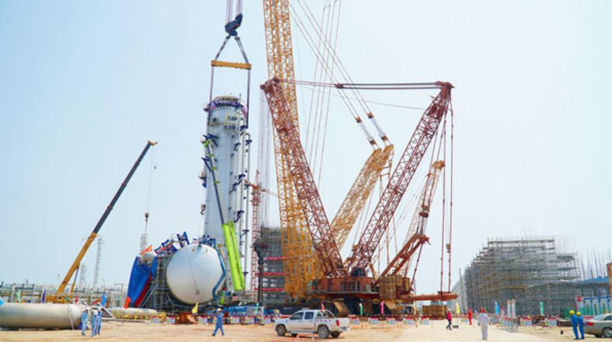 完成这样的大工程所需的“工具”也不简单。XGC88000型4000吨级履带吊车为主吊车,1250吨级履带吊车为溜尾递送吊车,两台吊车密切配合将设备由水平状态吊至直立状态,然后溜尾吊车脱钩,通过主吊车回转,将设备吊至指定位置。
