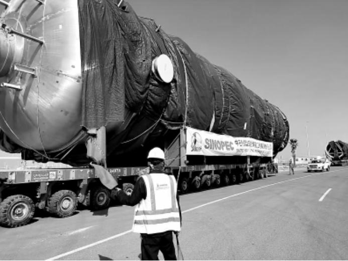 经过21天的运输,南京工程沙特乙二醇项目核心设备二氧化碳水洗塔,顺利运抵现场,成为首台走出国门运至沙特现场的700吨级设备。水洗塔是项目核心设备,运达现场后,项目部将全面开展吊装准备工作,确保8月21日水洗塔吊装就位。图为当地时间7月7日17时,工作人员在现场协调接卸工作。