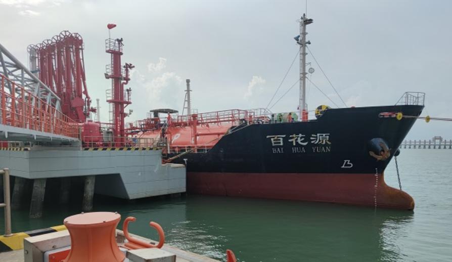 图为装载着中科炼化2000吨丁二烯的“百花源”轮船