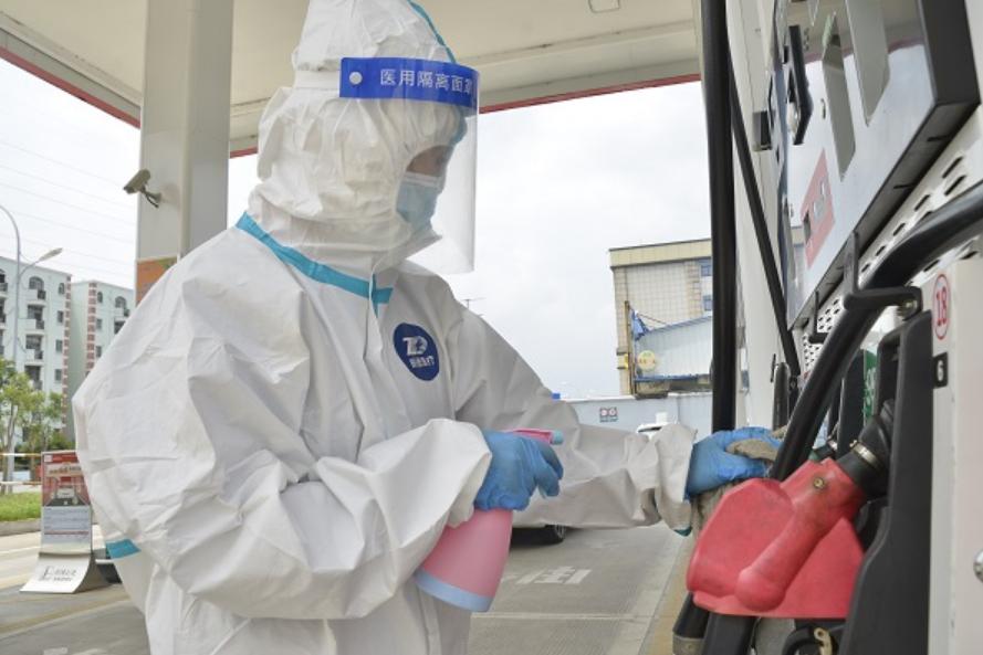 图为位于高风险区域的扬州武塘加油站,站长郭志懋正在对加油机进行消毒