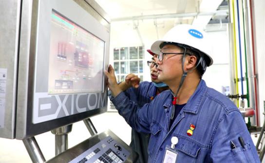 投料试车阶段,员工正在全密度聚乙烯装置挤压机房检查装置运行情况。李秦摄