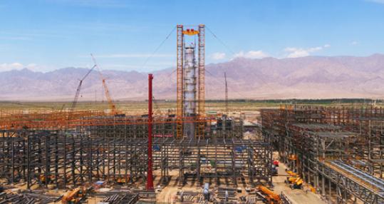 2020年8月3日,总重492吨、高75.9米的乙烯塔,历时近8小时成功吊装就位,它是项目的“第一高塔”。陈士兵摄