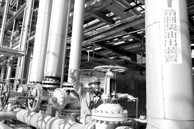 图为工作人员操作手阀,将精制柴油送往成品首站。李海娇摄
