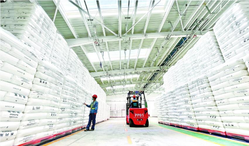 12月20日,海南炼化100万吨/年乙烯项目20万吨/年气相法聚丙烯装置顺利打通全流程,产出合格产品。这标志海南炼化实现共聚工艺生产聚丙烯产品零的突破,新材料产品的高端化发展又迈出新的步伐。图为员工对入库聚丙烯产品进行检查盘点。吴淑汕摄郑雄高刘海龙文