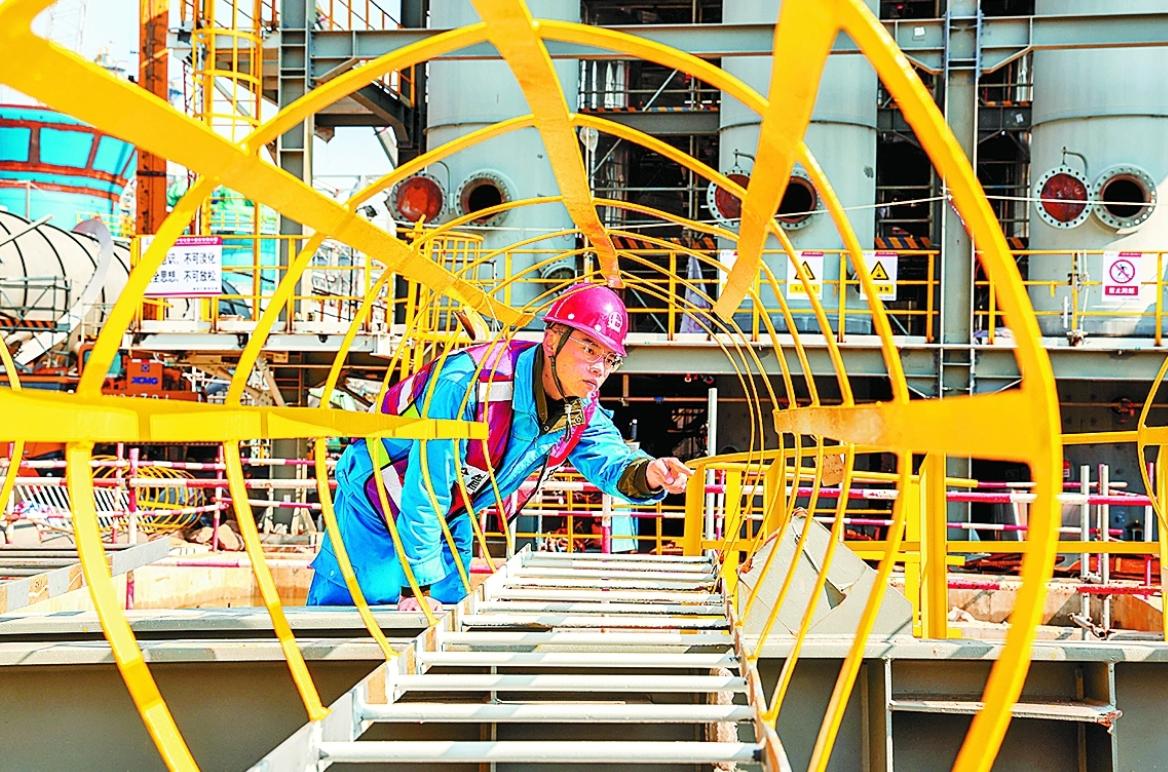 扬子石化高质量推进炼油结构调整项目建设,大力推广模块化施工,主体设备吊装前“穿衣戴帽”,对设备平台等实行地面安装焊接,有效降低高空作业安全风险。图为2月15日施工人员检查塔梯焊接质量。