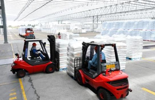 春耕时节,农膜的市场需求增加,福建联合石化开足马力,多产、多储、多销农膜原料,全力助力春耕生产。目前,该公司已形成聚乙烯7042、7050、7050A等3个系列产品,其韧性、刚性、耐热性、耐寒性等满足农业生产需要,今年以来有6万吨农膜原料投放市场。图为2月23日,员工运送农膜原料出厂。肖万元摄