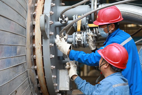 第一联合车间员工维护催化裂化装置。田红营 摄