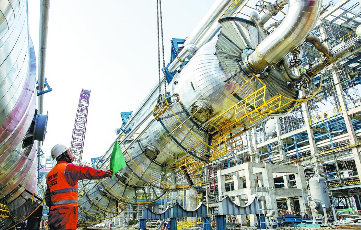 巴陵石化年产60万吨己内酰胺产业链搬迁与升级转型发展项目工地上,8000多名建设者加紧作业,瞄准中交目标稳步推进项目建设。截至目前,项目总体进度完成94%。图为日前大件设备脱酯塔吊装场景。