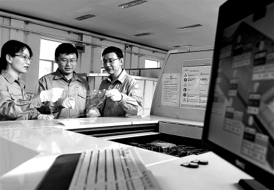 团队科研人员探讨BOPE薄膜制备工艺。本报记者潘亚男摄