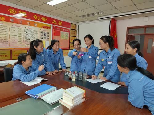 检验计量中心“张凤华创新工作室”带头人张凤华(左一)组织青工通过指示剂的变化分辨试样组分。朱世平 摄