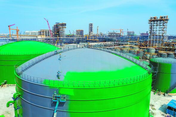 今年以来,天津南港乙烯项目建设团队坚持一体化管理思路,聚焦现场施工,优化工序衔接,实现设计、采购、施工高效协同联动,确保了关键节点任务按时完成。截至目前,项目进入工艺管道安装阶段,总体进度已完成77.6%,连续8个月领先统筹计划。图为近日施工人员对1.5万立方米生产水罐进行喷漆施工。