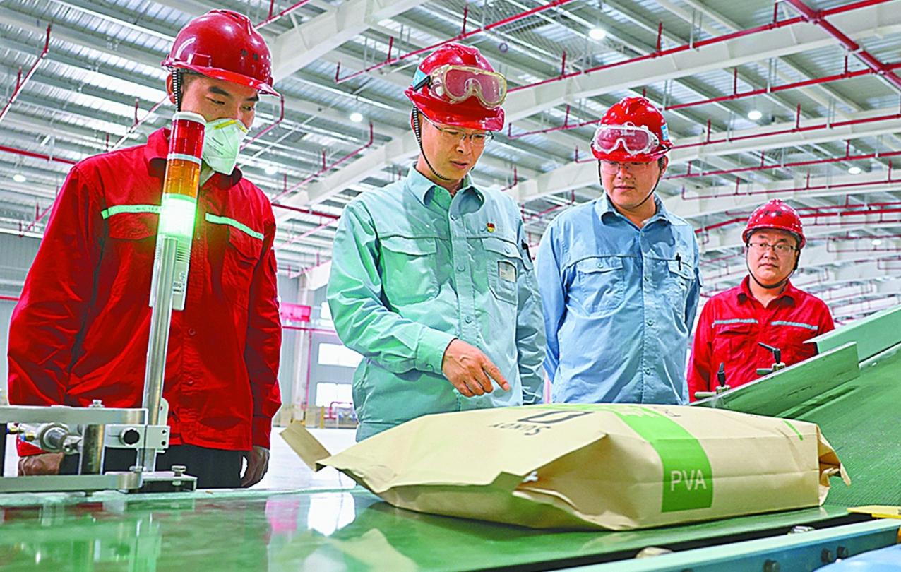 近日,川维化工公司聚乙烯醇(PVA)东区自动包装线改造项目正式投运,标志着该公司PVA全系列产品包装彻底告别人工包装、实现智能化统一包装。图为技术人员检查自动包装线运行情况。