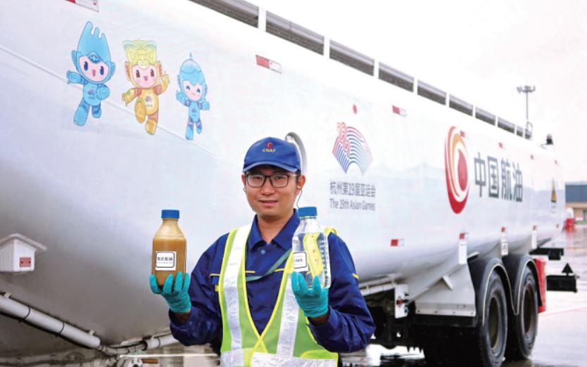 图为“亚运航班”加注中国石化生物航空煤油现场。