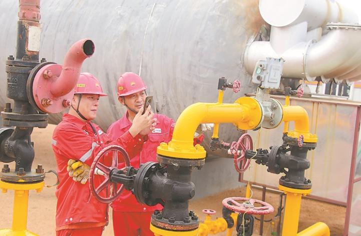 图为10月13日,沈阳采油厂采油作业四区岗位员工在生产现场对脱水站设备设施检查并拍照记录,确保生产稳定运行。