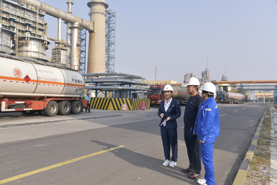 图为销售人员陪同客户参观芳烃类液体产品装车现场。王昌浩 摄