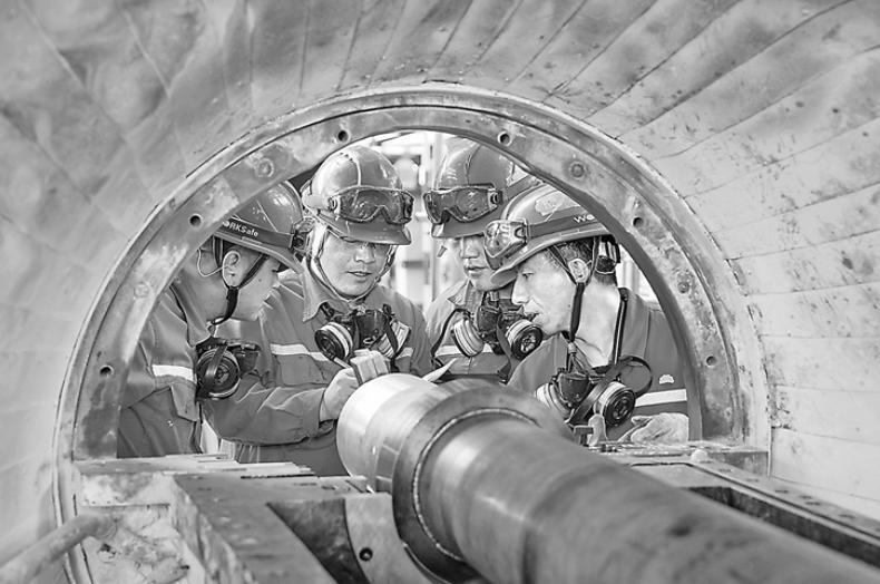 ②在催化裂化装置烟机检修现场,参检人员复核烟机数据。