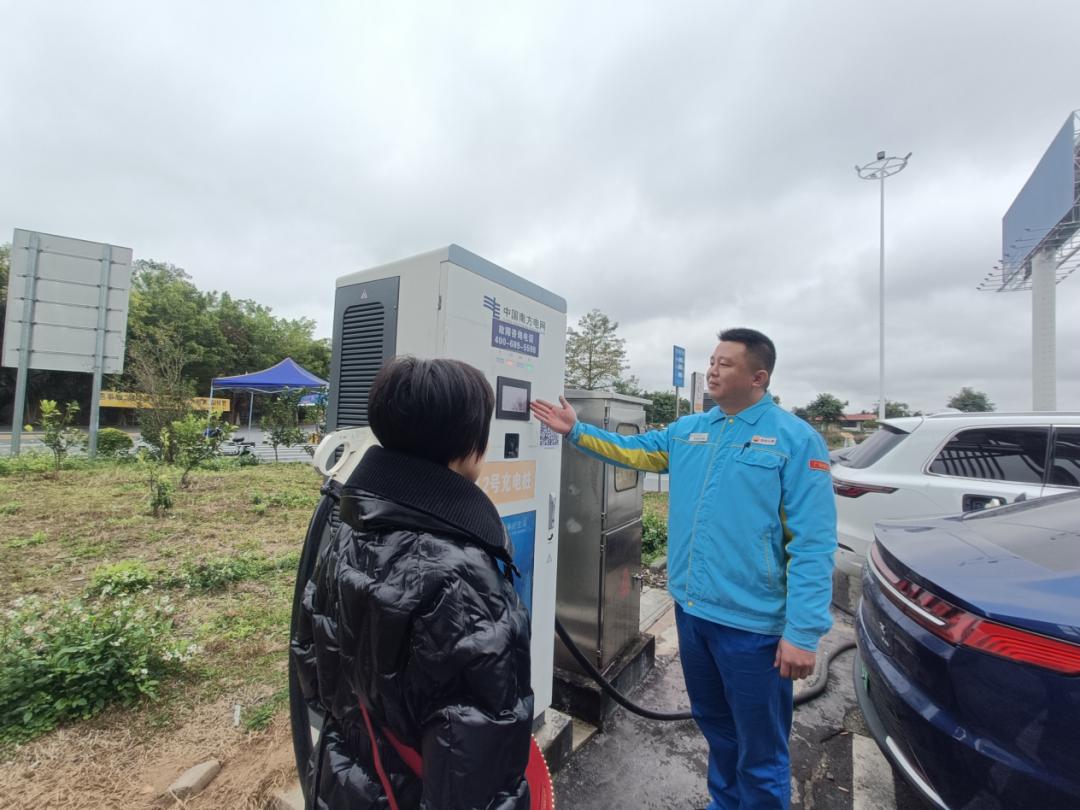 位于G80广昆高速公路容县段持续迎来返工车辆高峰,广西销售玉林分公司容县服务区员工在现场快速地指挥车辆,指导新能源车主使用充电桩加电。