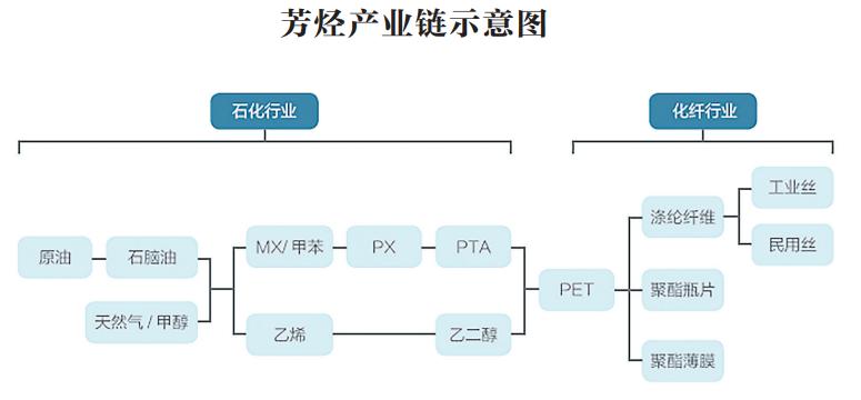 芳烃,化学工业的重要根基,广泛用于合成材料及医药、农药、建材等领域。对二甲苯(PX)是用量最大的芳烃品种之一,PX产业链是石化工业最重要的链条之一,上游为石化行业,中游为聚酯涤纶行业,下游为纺织服装行业,与人民生活紧密相关。世界上98%以上的PX用于制备PTA(精对苯二甲酸),而98%以上的PTA又用于生产PET(聚对苯二甲酸乙二醇酯)。