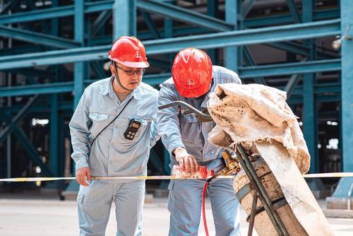 海南炼化2号连续重整轻重石脑油分离项目建设以来,作业人员战高温,24小时轮换施工,奋力推进项目建设。采取布置遮阳伞、调整作业时间等措施,做好防中暑工作。目前,现场施工进入管道试压阶段,为高质量中交奠定基础。图为4月29日HSE部人员检查乙炔气瓶和管带连接情况。