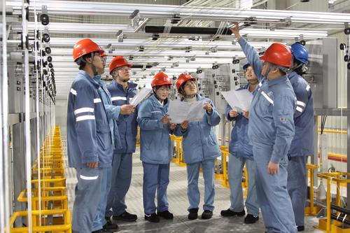 团队成员在百吨级高性能碳纤维生产线现场解优化难题。 胡拥军 摄