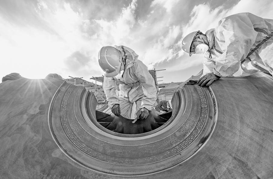 110万吨/年乙烯装置裂解气压缩机组经过连续5年运行,壳体及隔板内部流道附着了厚厚的裂解气油垢。虽然使用高压水枪可将大部分油污清除,但很多边边角角的油垢仍无法清除干净,且冲洗后容易产生锈迹。为将机组配件彻底清理干净,独山子石化团委成立青年突击队,用砂纸手工打磨清理裂解气压缩机组缸盖及50块隔板,保证了检修整体进度。