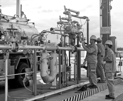 日前,海南炼化新建航煤装卸车站台投用,标志着该公司顺利打通航煤车运全流程,进一步优化航煤运输方式。图为6月19日技术人员在该站台进行航煤充装作业。李晓倩 摄 王梦璐 文