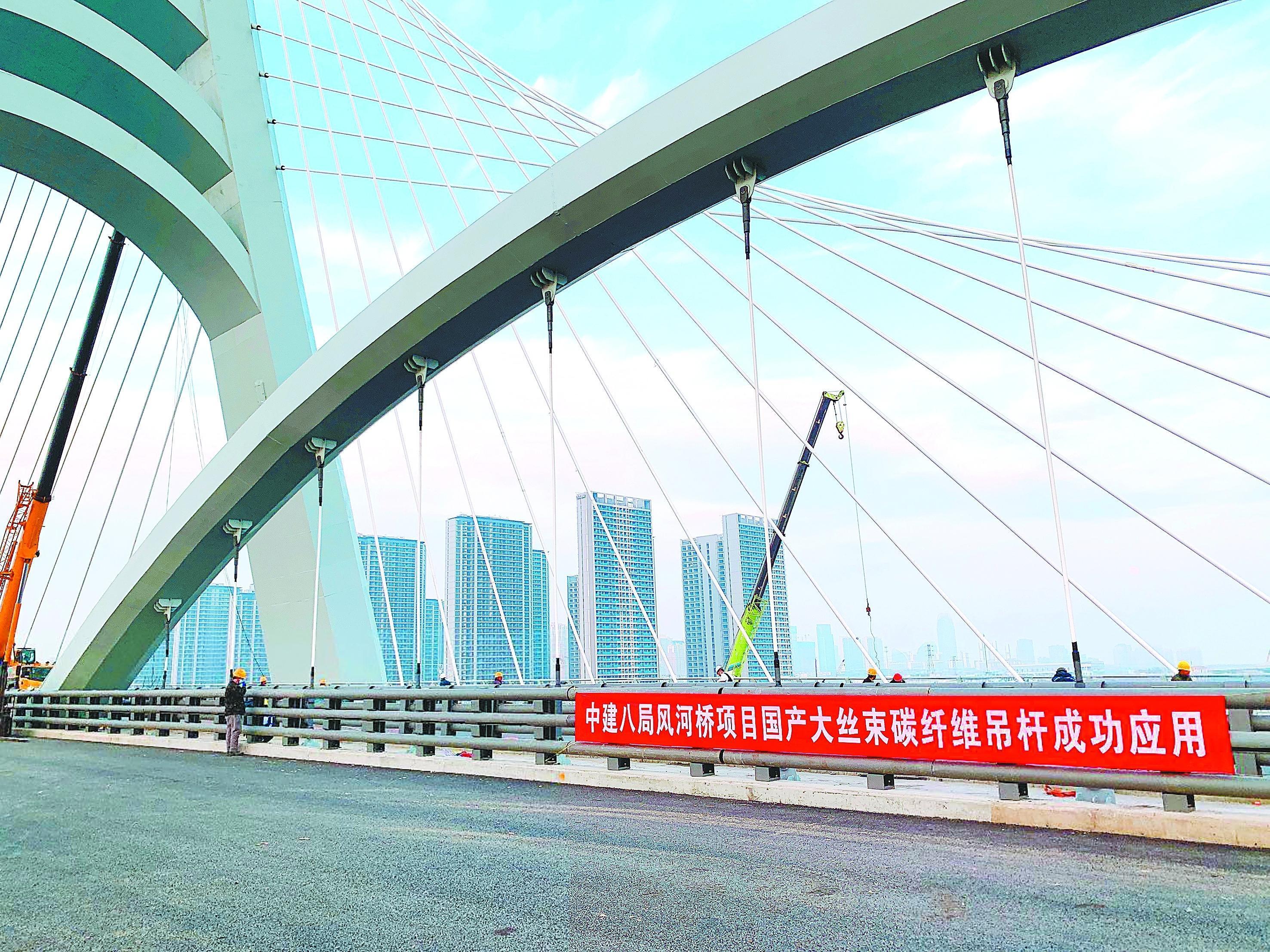 将数十根甚至数百根较细的碳纤维筋集结成拉索,可应用于大跨度桥梁。这得益于碳纤维筋较高的比强度和比模量,将其作为悬索桥主缆,可提高桥梁的承载效率和跨径,以及桥梁的抗风雨振动性能,并从根本上解决钢丝缆索的腐蚀和疲劳问题,实现具有轻量化、长寿命特征的高性能桥梁结构。