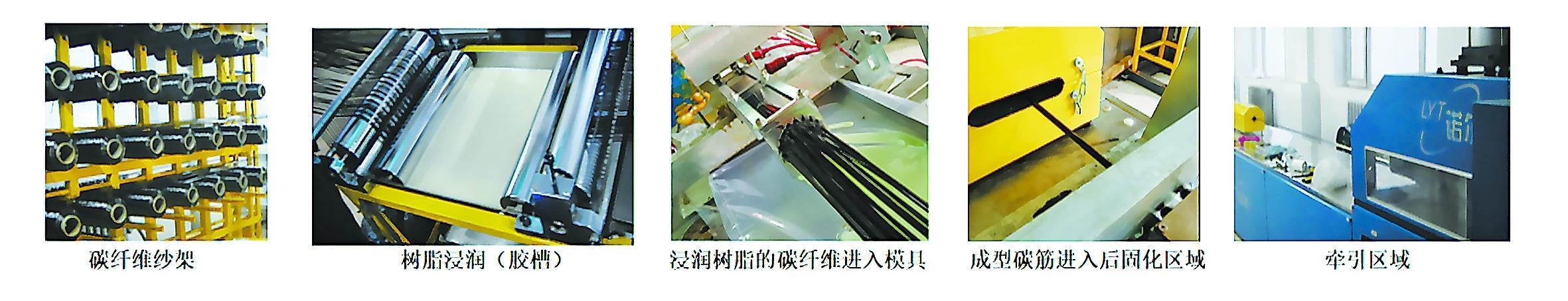 模具前一般配有预成型模,在预成型模处多余的树脂被挤出,之后进入加热的成型模具。在加热的模具中,树脂逐步升温固化,并按模具形状形成直径一致的圆形棒材。模具后一般配有加温的后固化箱,可提高碳纤维筋的固化度和综合性能。