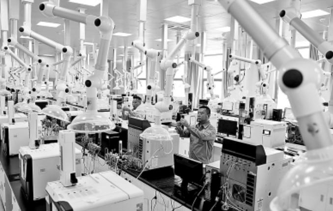 作为集团公司推进企业优化管理层级改革试点单位,湖南石化聚焦组织架构一体化、业务流程一体化、绩效薪酬一体化的管理目标,稳步推进机构改革和扁平化改革。在深化改革和己内酰胺搬迁升级项目建设过程中,湖南石化大力推进数字化应用场景建设,降低人力成本,整合原己内酰胺站、煤化工站、煤炭站3个分析站成立检验中心分析室,人员精减15%,通过站点整合强化专业管理,提高工作效率。图为7月22日,分析室两名当班员工进行色谱分析。