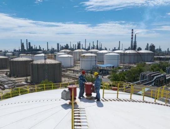今年以来,天津石化紧盯市场行情,优化生产流程,调整产品结构,灵活排产,确保优势装置满负荷运行。优化汽油调和配方,采取调整石脑油干点等措施全力增产航煤。截至7月底,成品油收率稳步提升至50%以上。图为该公司炼油部油品车间技术人员检查成品油罐设备情况。