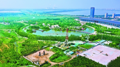 连日来,胜利油田加快推进山东东营市华泰金融中心吾悦广场深层地热能替代燃煤供暖项目,确保在今年供暖季前建成投产。该项目是胜利油田与东营市合作建设的中深层地热供暖项目,与燃煤锅炉房集中供暖相比,预计每个采暖季可节省标准煤1.11万吨。图为施工现场。
