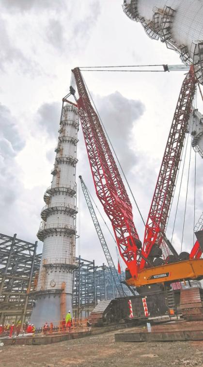 广西石化项目施工现场,乙烯塔成功吊装就位。