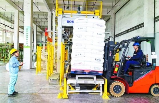图为广州石化聚丙烯产品套膜包装出厂。