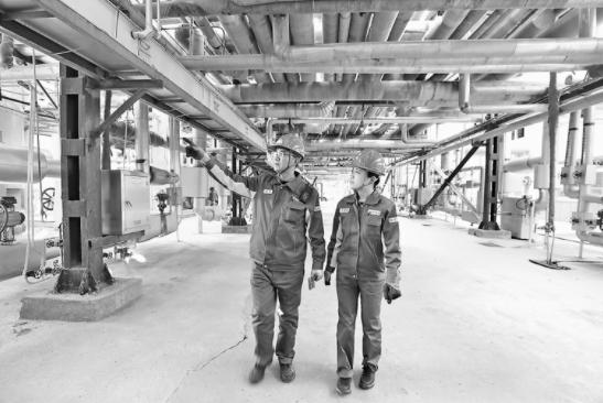 辽河石化炼油二部员工在催化裂化装置区给刘晨曦(右)讲解流程。