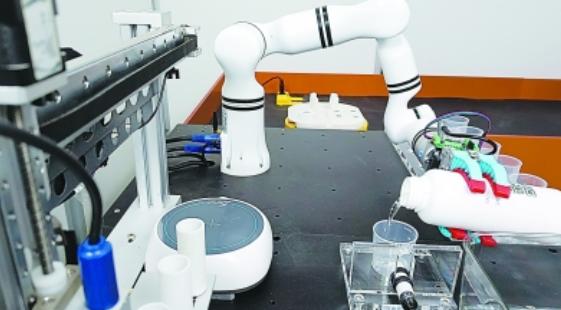 天津南港乙烯项目中心化验室机器人进行取样操作。
