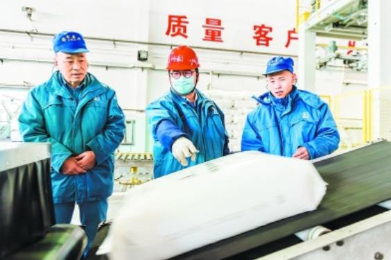 天津石化化工工艺高级专家吴文清(中)在产品包装线上检查包装质量。