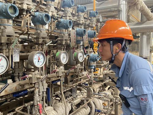 春节期间,海南炼化基层一线员工默默坚守在工作岗位上,抓紧生产适销对路产品,满足市场需求,用坚守点亮节日灯火,确保装置安稳运行。图2为员工检查1号加氢裂化装置压缩机运行情况。