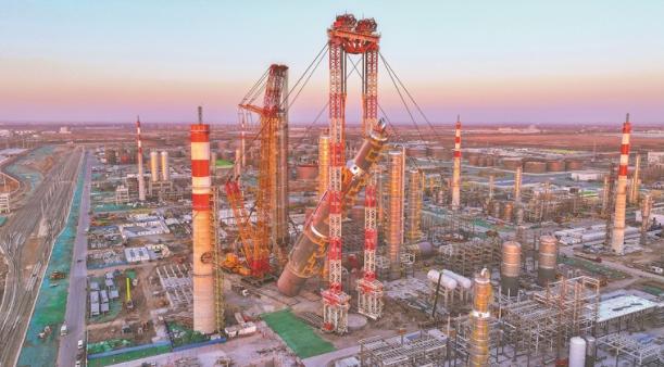 2月26日,在华锦阿美精细化工及原料工程项目施工现场,工程建设公司一建分公司利用自主研发的MYQ型5000吨门式起重机与4000吨履带式起重机协同作业,经过1小时36分钟的精细操作,成功将总重量达4366吨的抽余液塔精准吊装到位。此次吊装的抽余液塔不仅是整个项目中最大的单体设备,而且是同类型塔器中直径最大、高度最高的设备。其最大外径为14.76米,长度达117.8米,最大壁厚为180毫米。