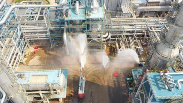 近日,海南炼化开展2025年首场大型综合应急演练,现场处置人员与消防车、机器人、无人机、视频监控形成全方位应急处置网络,各演练单位响应迅速、处置有序,全面提升了公司对突发异常事件的紧急处置、应急响应、协同作战能力。图为应急演练现场。